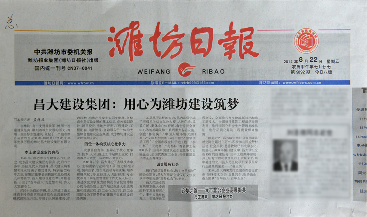 《昌大建設(shè)集團——用心為濰坊建設(shè)筑夢》——濰坊日報2014年8月22日第二版