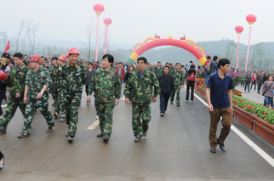5月12日,由集團(tuán)公司第二分公司援建的北川新縣城安昌河西羌北橋工程舉行了隆重的竣工通車儀式。濰坊市委常委、副市長、山東省援川前方總指揮徐振溪,北川新縣城工程建設(shè)總指揮王綿生,北川縣副縣長荊大中,濰坊市援川前方總指揮桑福嶺等領(lǐng)導(dǎo),參加援川的濰坊各方面代表、當(dāng)?shù)厝罕娊顺鱿私裉斓耐ㄜ噧x式。集團(tuán)公司總經(jīng)理朱九洲及參加援建的有關(guān)分公司經(jīng)理出席了今天的通車儀式。 ![]() 總經(jīng)理朱九洲(前排左四)與援建人員共享援建成果 ![]() 首個(gè)通過大橋的車輛