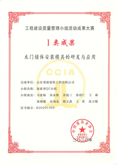 近日,中國建筑業(yè)協(xié)會頒發(fā)2020年科技成果榮譽。山東鳶港裝飾工程有限公司“探索者QC小組”的成果《木門鎖體安裝模具的研發(fā)及應用》在本組54項成果中脫穎而出,以全組第三名的成績被評為Ⅰ類成果,獲得2020年全國一等獎。這是此小組成果繼獲得山東省建筑業(yè)協(xié)會QC成果一等獎后,又獲得的一國家級榮譽。